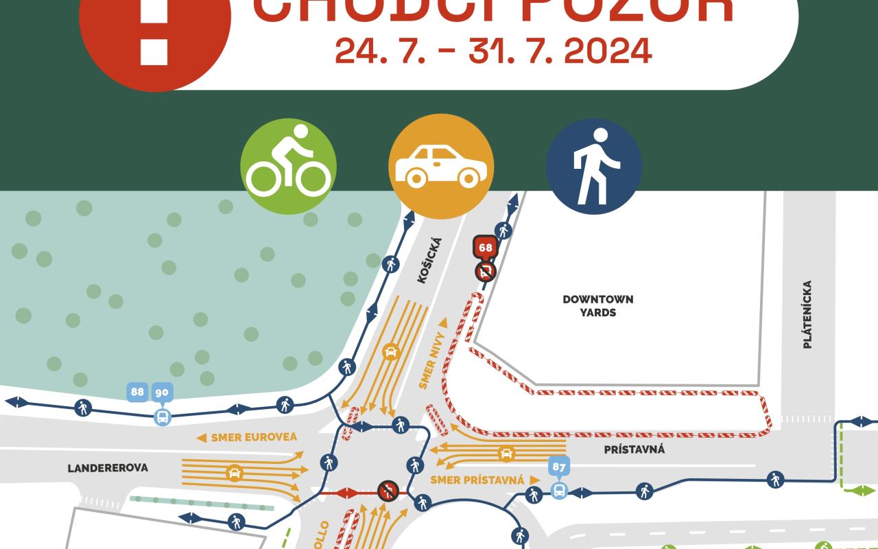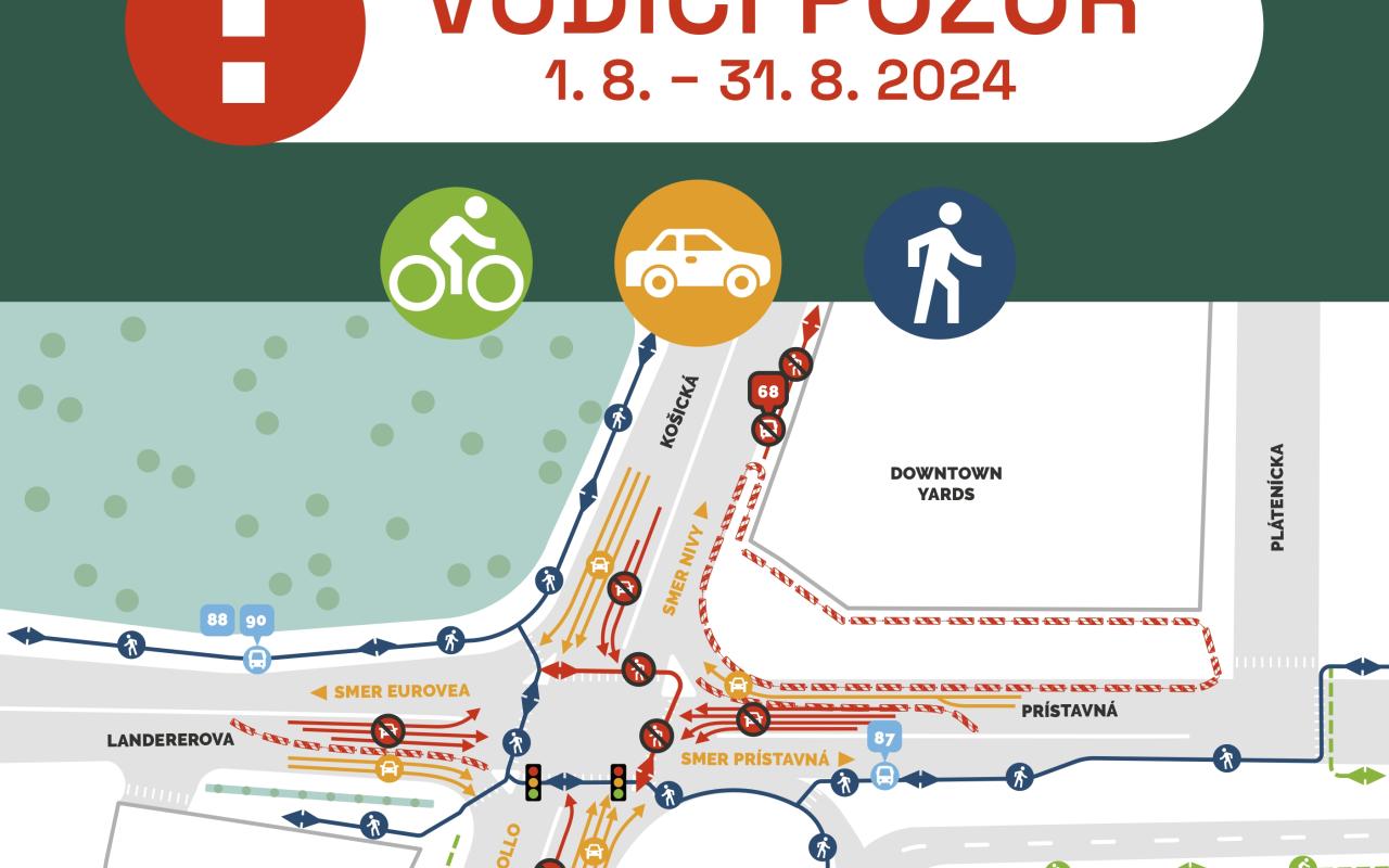 1. fáza: 15. 6. – 31. 7. na etapy uzavretý chodník na Prístavnej, Landererovej a Košickej ulici a priliehajúce priechody pre chodcov, zúženie jazdných pruhov, dočasné zrušenie autobusovej zastávky na Košickej (od 12. 6. do ukončenia celej rekonštrukcie križovatky)